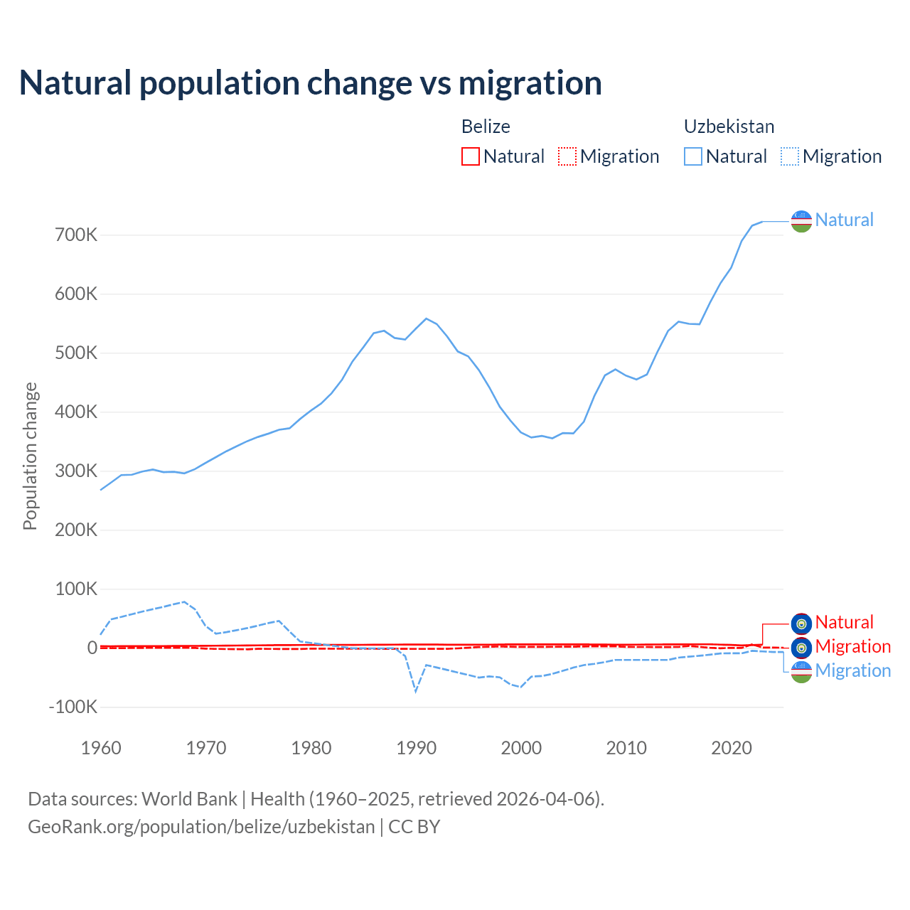 Over the last 10 years, 79.6% of the population change in Belize is from natural causes (a gain of 54,754 people) and 20.4% is from migration (a gain of 14,073 people). In Uzbekistan 98.2% is from natural causes (a gain of 6,161,117 people) and 1.84% is from migration (a loss of 115,398 people).