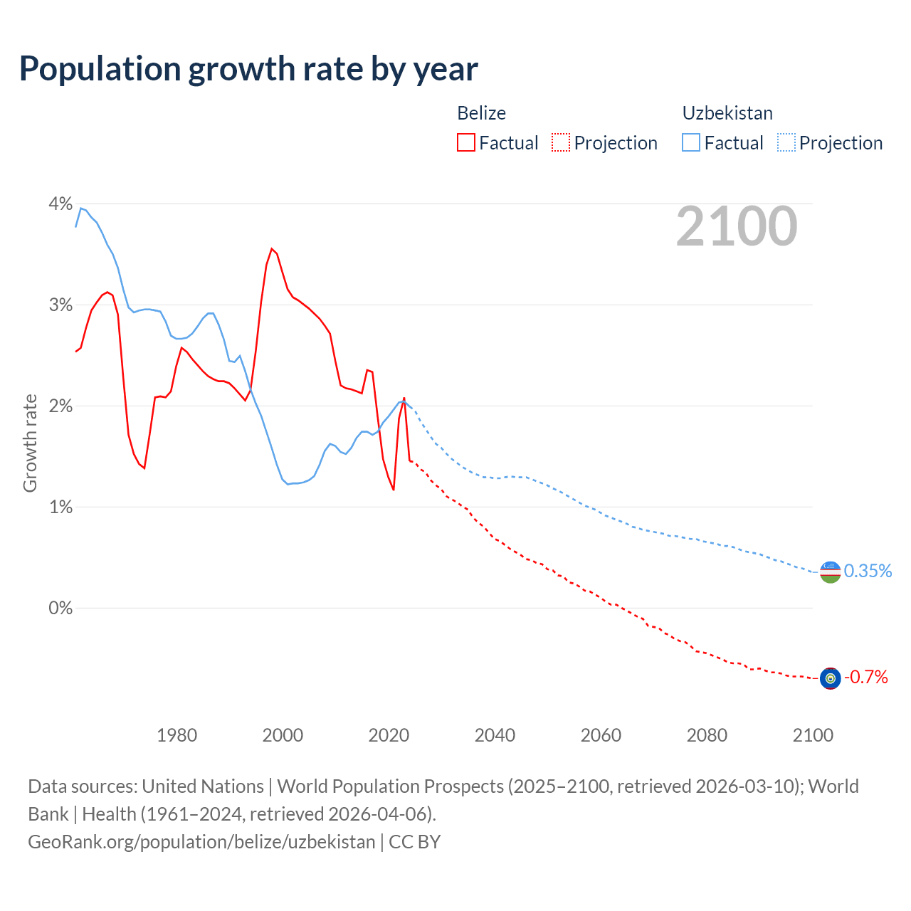 - For the last 10 years, Belize has had an average growth rate of +1.83% per year vs +1.85% in Uzbekistan.