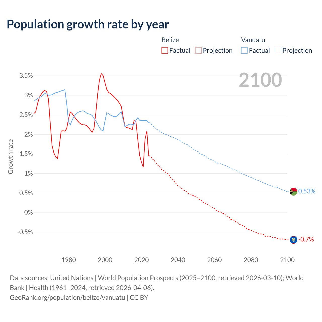 - For the last 10 years, Belize has had an average growth rate of +1.83% per year vs +2.33% in Vanuatu.