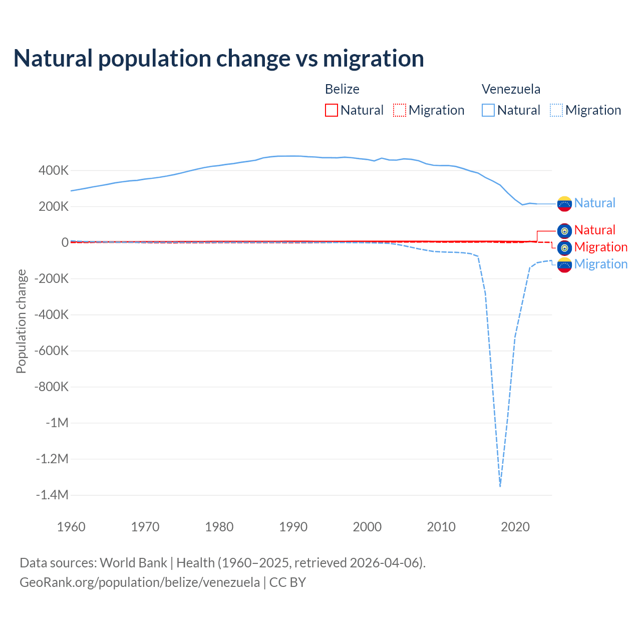 Over the last 10 years, 79.6% of the population change in Belize is from natural causes (a gain of 54,754 people) and 20.4% is from migration (a gain of 14,073 people). In Venezuela 38.6% is from natural causes (a gain of 2,946,257 people) and 61.4% is from migration (a loss of 4,683,227 people).
