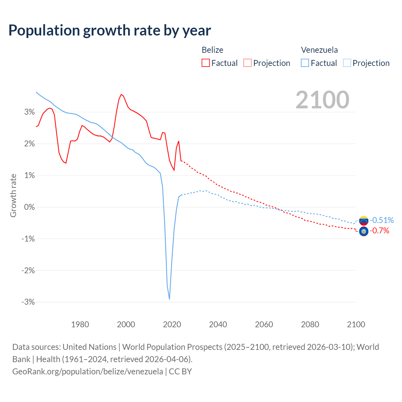- For the last 10 years, Belize has had an average growth rate of +1.83% per year vs -0.46% in Venezuela.