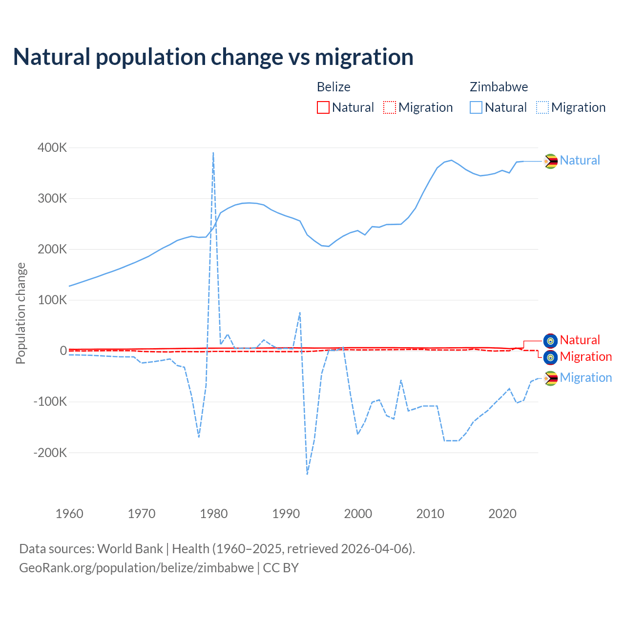 Over the last 10 years, 79.6% of the population change in Belize is from natural causes (a gain of 54,754 people) and 20.4% is from migration (a gain of 14,073 people). In Zimbabwe 74.9% is from natural causes (a gain of 3,558,487 people) and 25.1% is from migration (a loss of 1,192,807 people).
