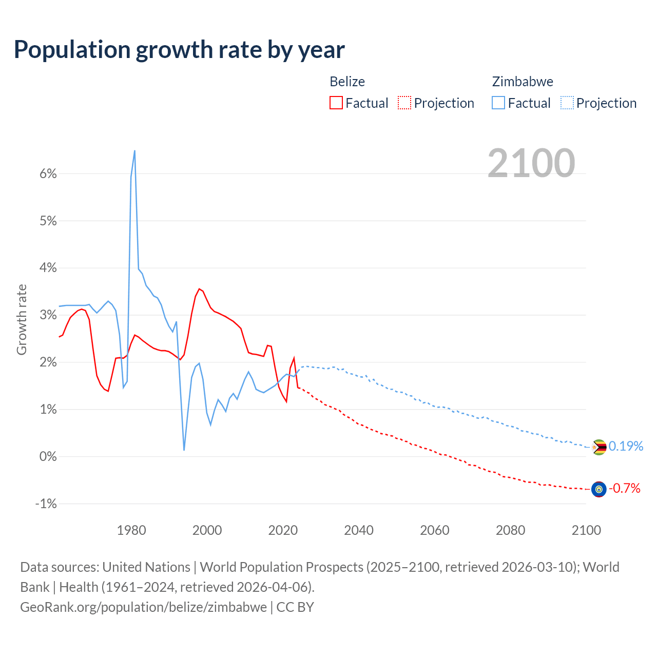 - For the last 10 years, Belize has had an average growth rate of +1.83% per year vs +1.57% in Zimbabwe.