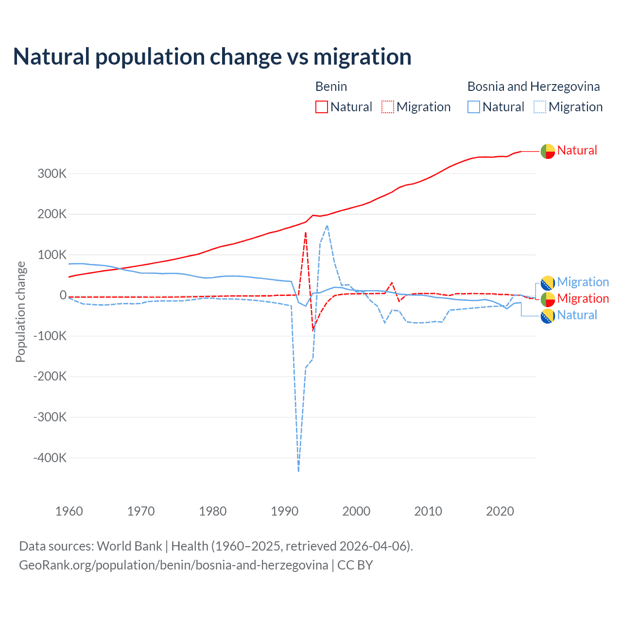 Over the last 10 years, 99.3% of the population change in Benin is from natural causes (a gain of 3,397,218 people) and 0.71% is from migration (a gain of 24,401 people). In Bosnia and Herzegovina 41.1% is from natural causes (a loss of 169,384 people) and 58.9% is from migration (a loss of 243,117 people).