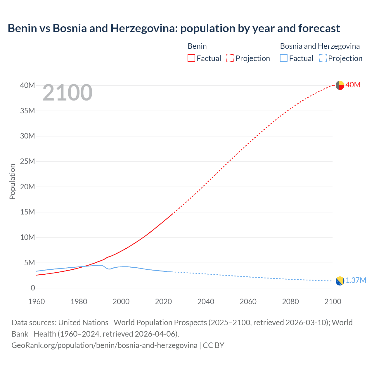 Benin vs Bosnia and Herzegovina: population by year and forecast