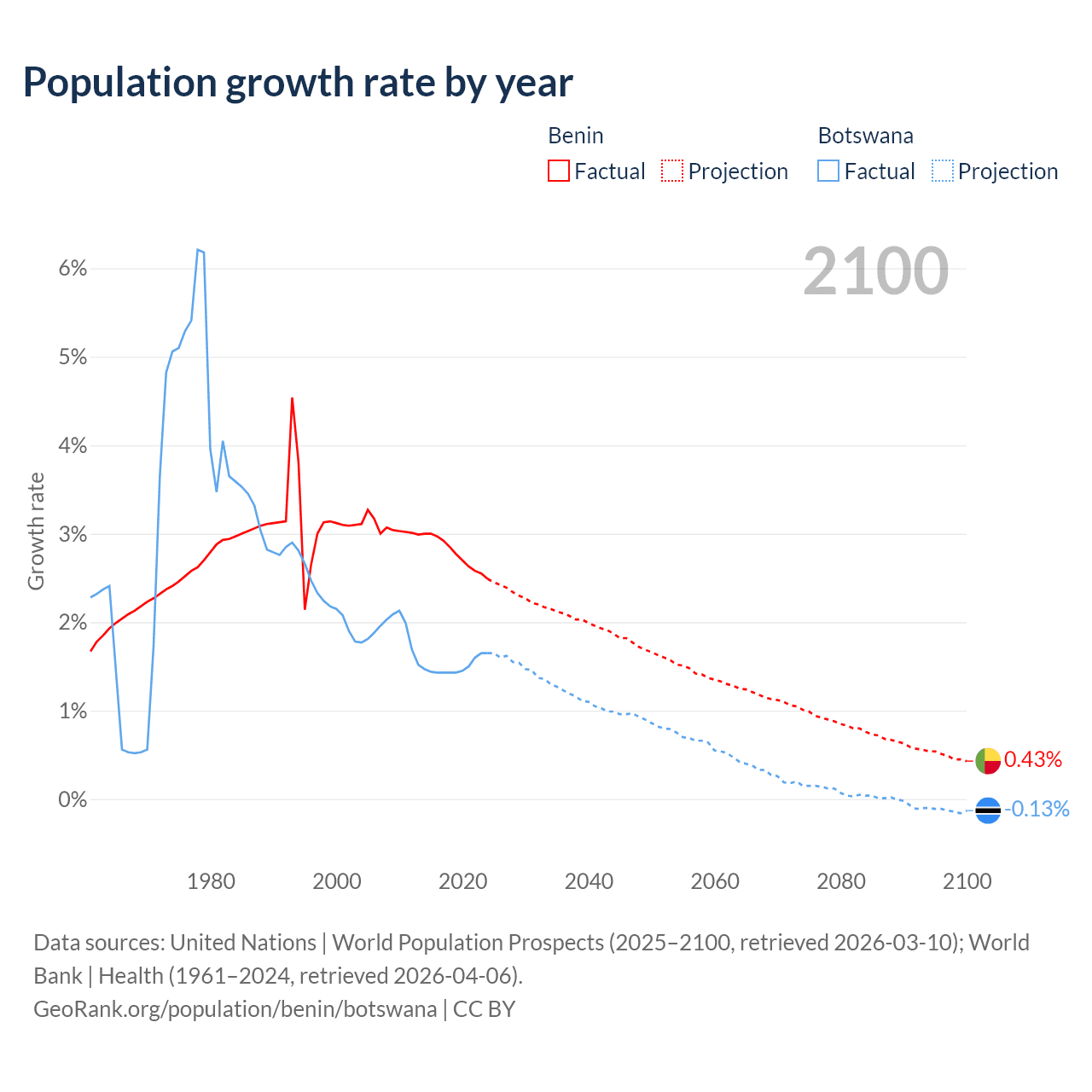 - For the last 10 years, Benin has had an average growth rate of +2.77% per year vs +1.5% in Botswana.