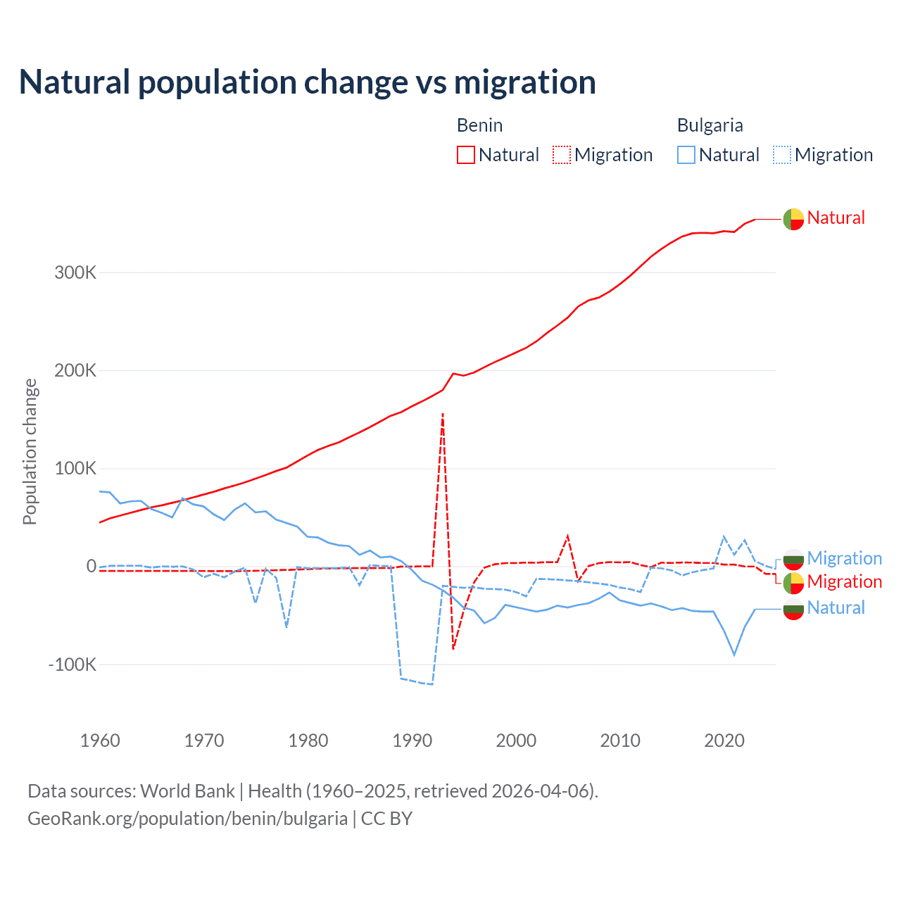 Over the last 10 years, 99.3% of the population change in Benin is from natural causes (a gain of 3,397,218 people) and 0.71% is from migration (a gain of 24,401 people). In Bulgaria 92.1% is from natural causes (a loss of 528,535 people) and 7.94% is from migration (a gain of 45,567 people).