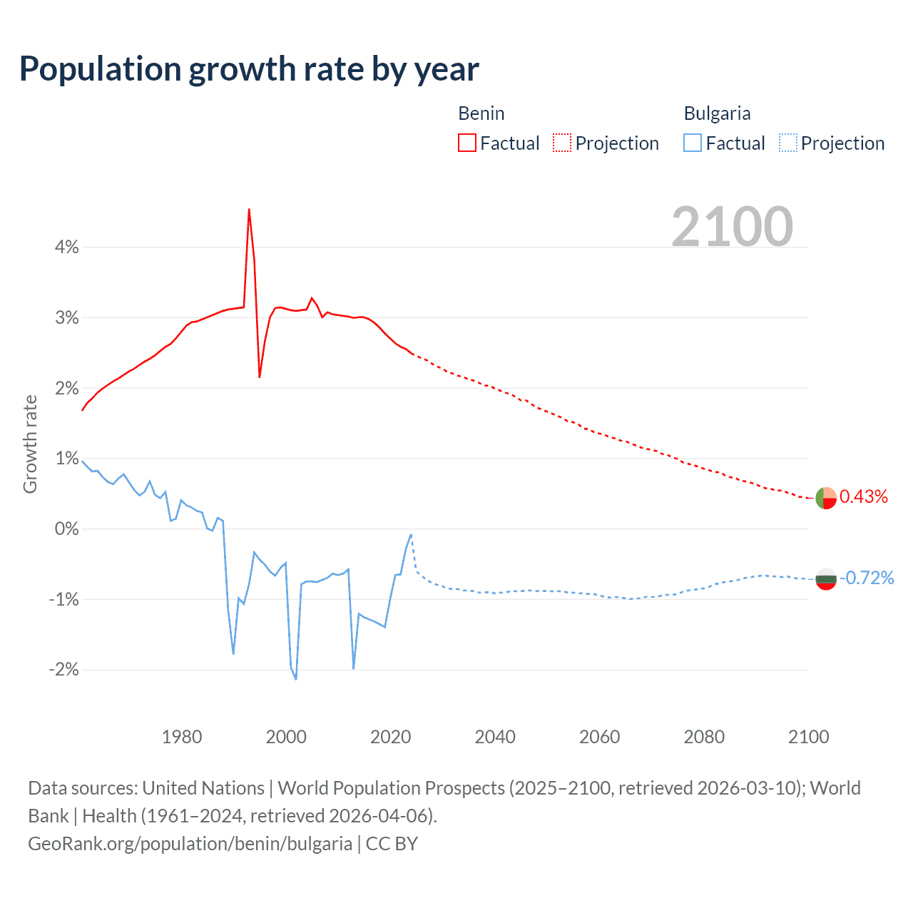 - For the last 10 years, Benin has had an average growth rate of +2.77% per year vs -0.96% in Bulgaria.