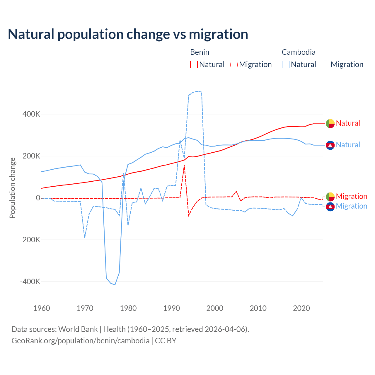 Over the last 10 years, 99.3% of the population change in Benin is from natural causes (a gain of 3,397,218 people) and 0.71% is from migration (a gain of 24,401 people). In Cambodia 85.2% is from natural causes (a gain of 2,724,147 people) and 14.8% is from migration (a loss of 474,505 people).