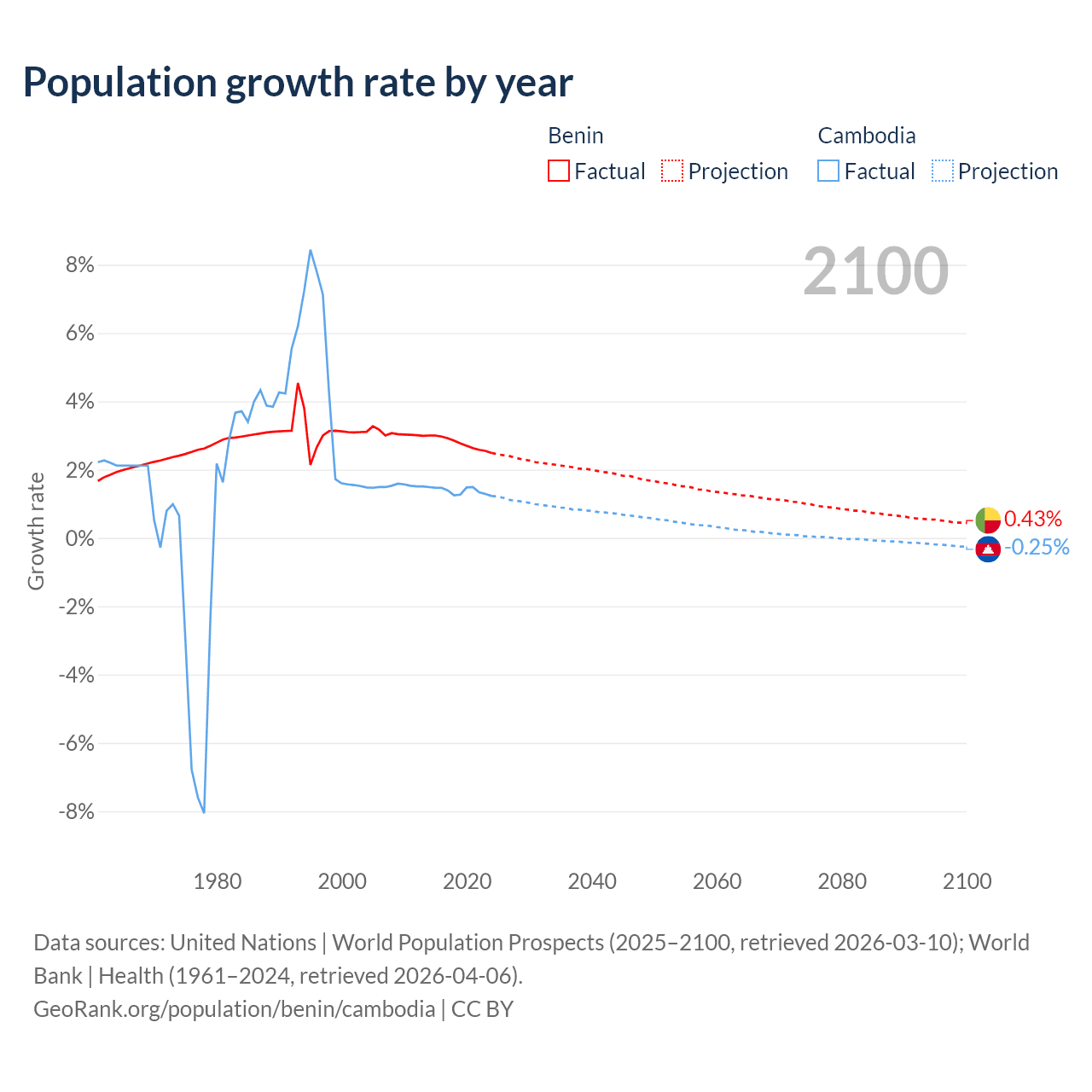 - For the last 10 years, Benin has had an average growth rate of +2.77% per year vs +1.38% in Cambodia.