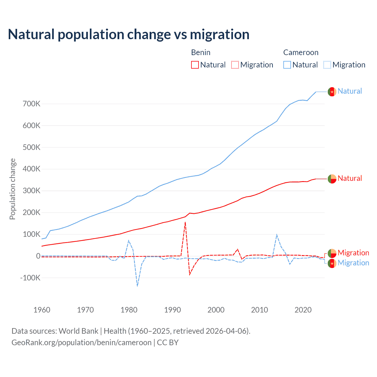 Over the last 10 years, 99.3% of the population change in Benin is from natural causes (a gain of 3,397,218 people) and 0.71% is from migration (a gain of 24,401 people). In Cameroon 99.1% is from natural causes (a gain of 6,982,395 people) and 0.9% is from migration (a gain of 63,139 people).