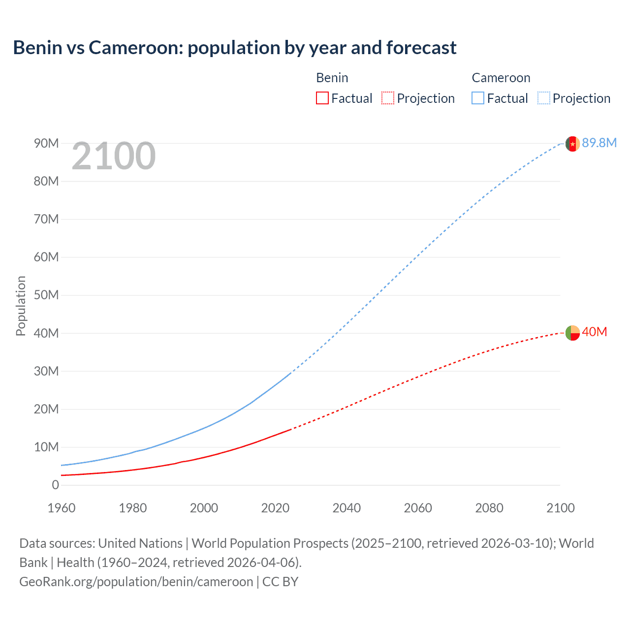 The latest officially reported population of Benin was 14,462,724 in 2024 vs 29,123,744 people in Cameroon in 2024. In 2026, based on the adjusted UN estimation, the current Benin's population is 15,272,847 people compared to 30,864,115 in Cameroon.