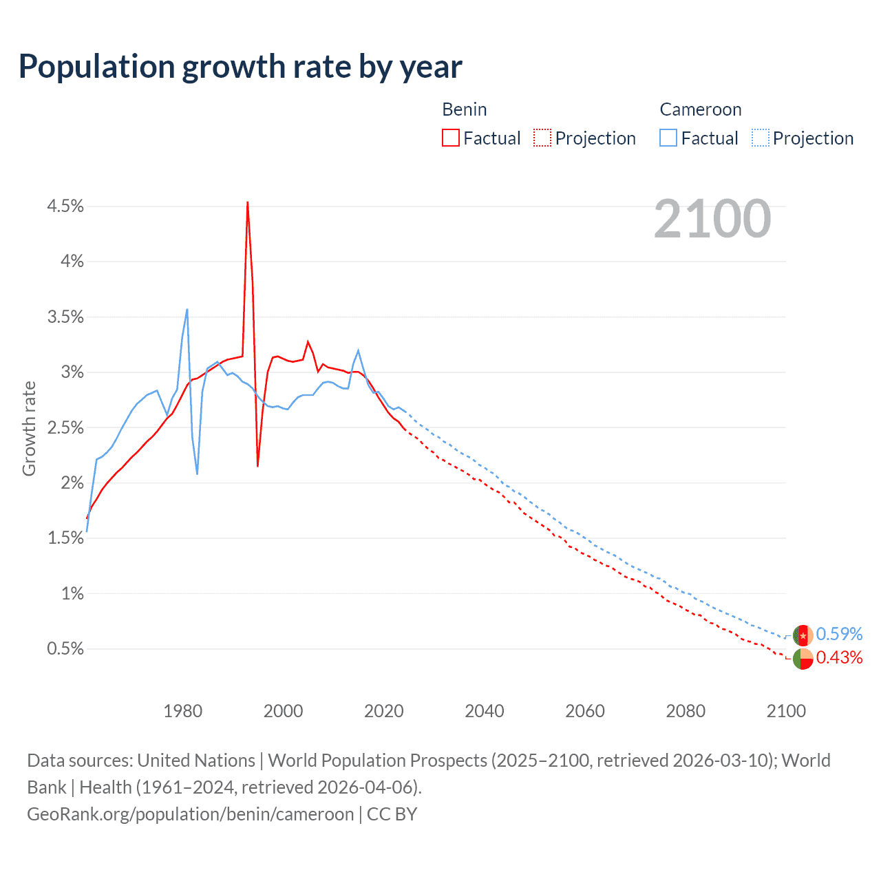 - For the last 10 years, Benin has had an average growth rate of +2.77% per year vs +2.84% in Cameroon.