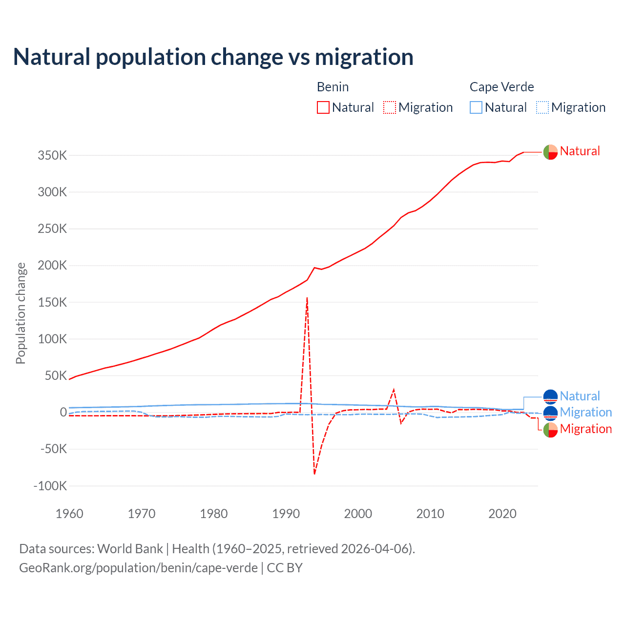Over the last 10 years, 99.3% of the population change in Benin is from natural causes (a gain of 3,397,218 people) and 0.71% is from migration (a gain of 24,401 people). In Cape Verde 56.4% is from natural causes (a gain of 50,193 people) and 43.6% is from migration (a loss of 38,879 people).