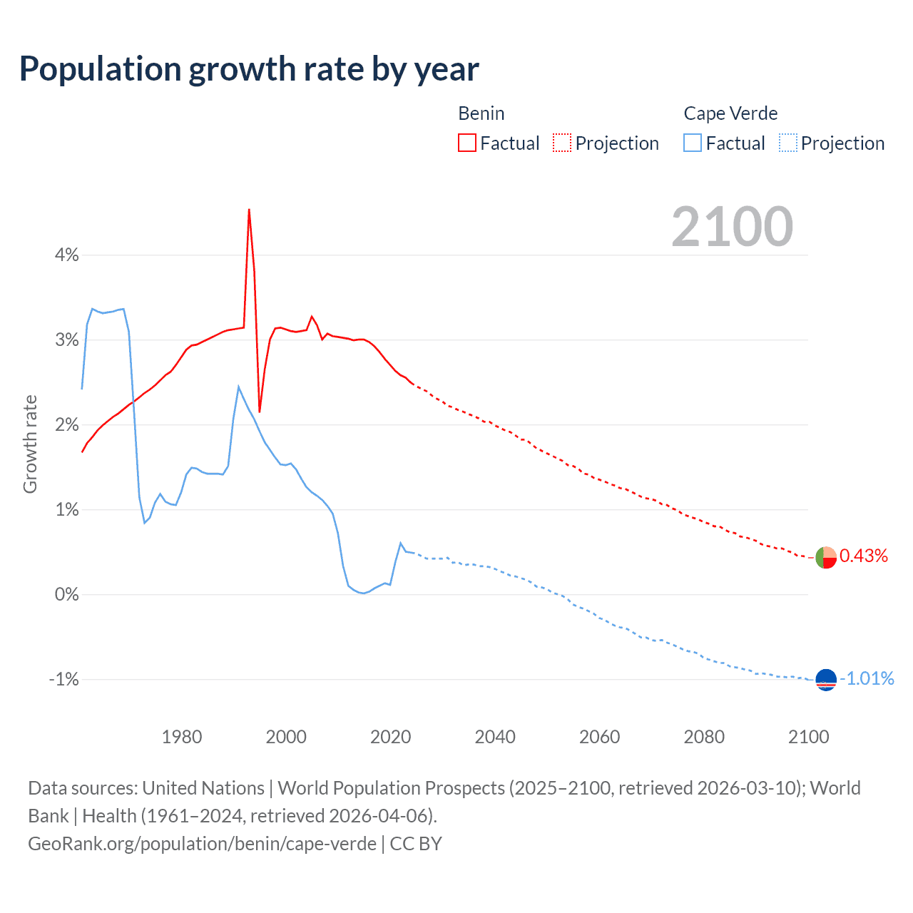 - For the last 10 years, Benin has had an average growth rate of +2.77% per year vs +0.22% in Cape Verde.