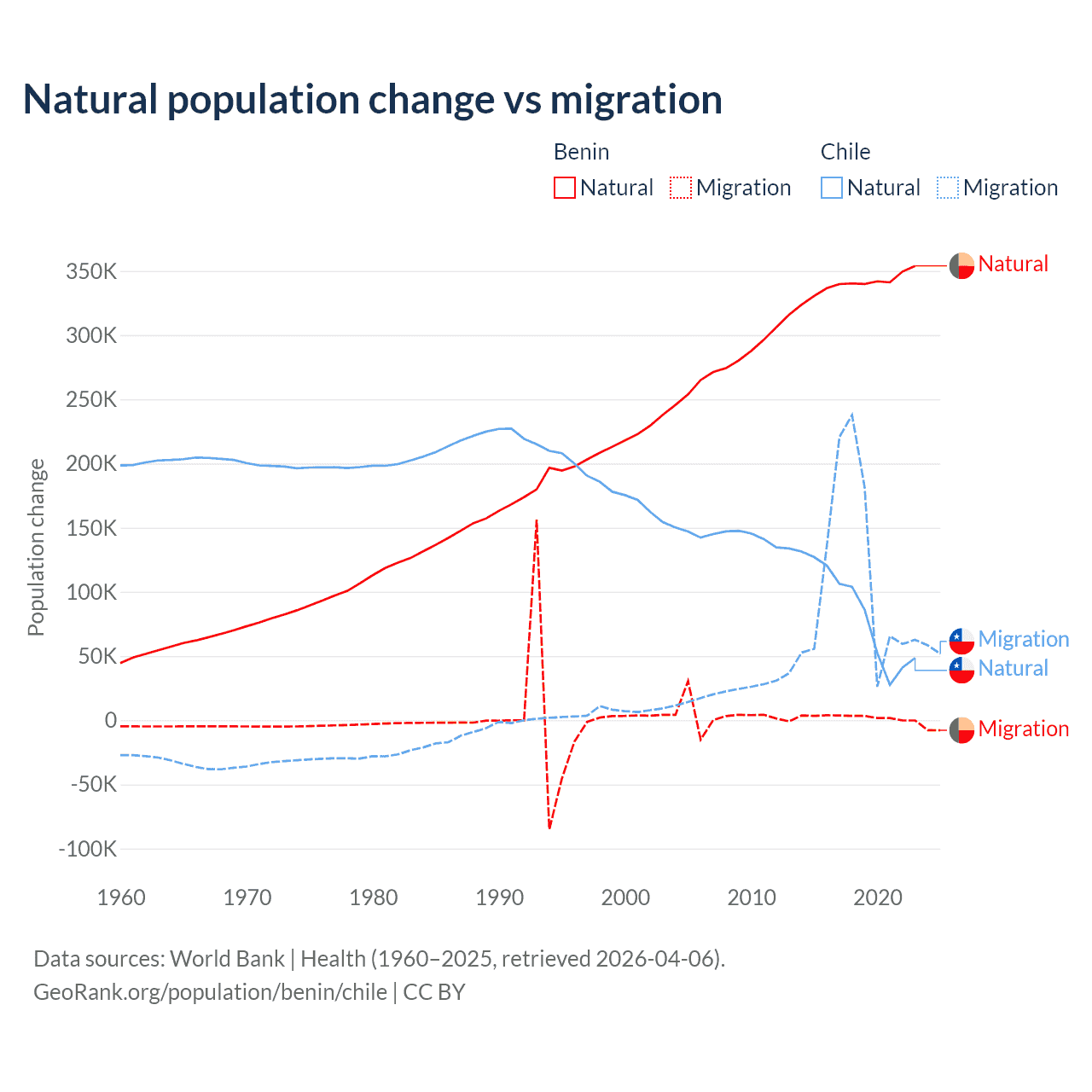 Over the last 10 years, 99.3% of the population change in Benin is from natural causes (a gain of 3,397,218 people) and 0.71% is from migration (a gain of 24,401 people). In Chile 43.5% is from natural causes (a gain of 844,683 people) and 56.5% is from migration (a gain of 1,097,597 people).