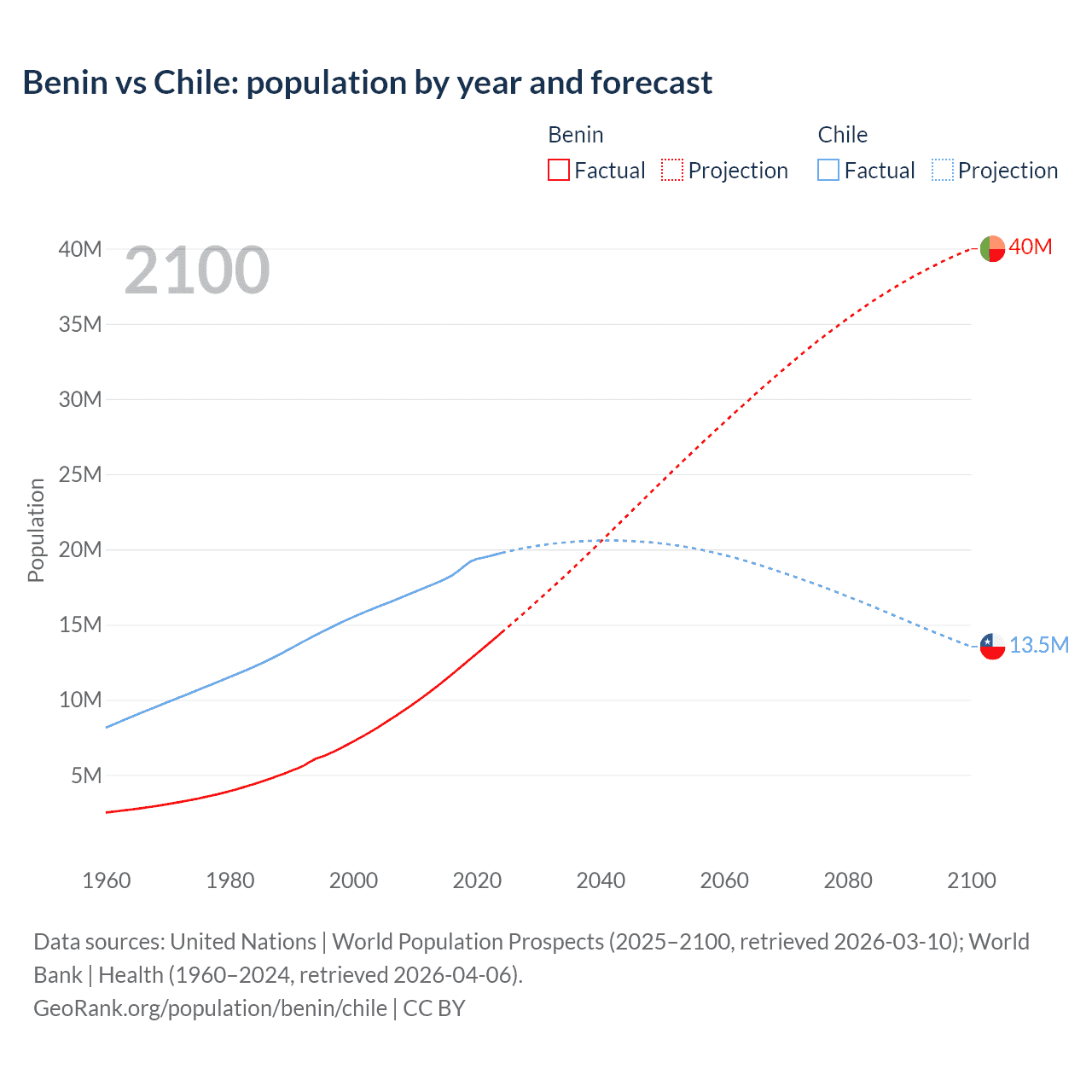 Benin vs Chile: population by year and forecast