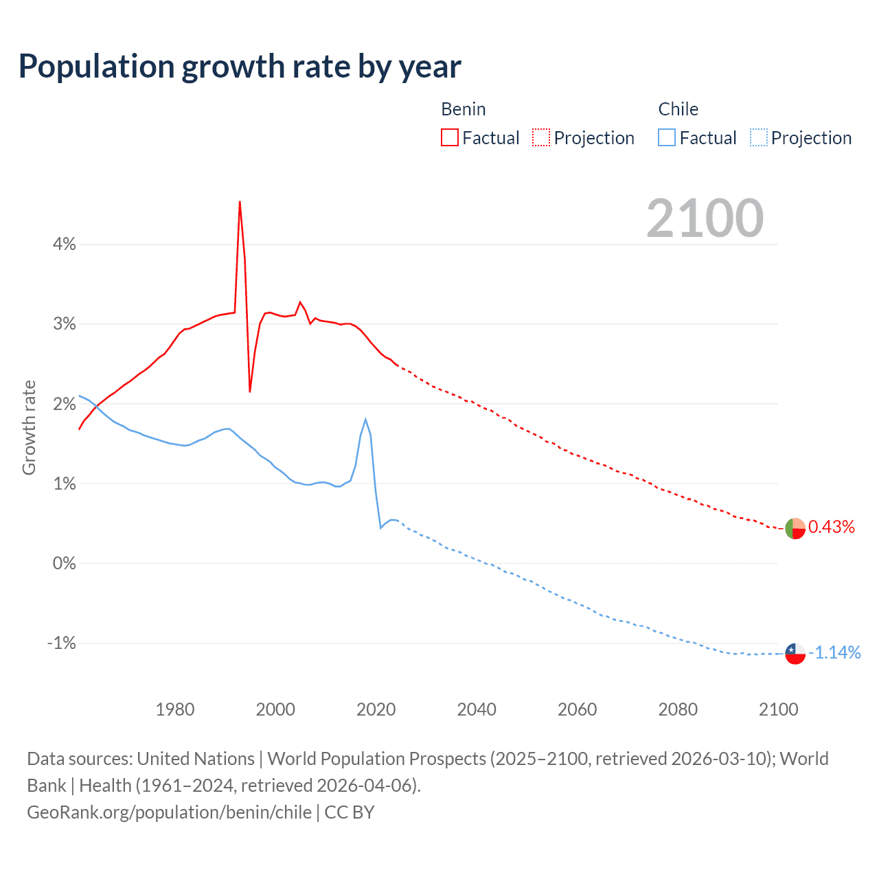- For the last 10 years, Benin has had an average growth rate of +2.77% per year vs +1.02% in Chile.