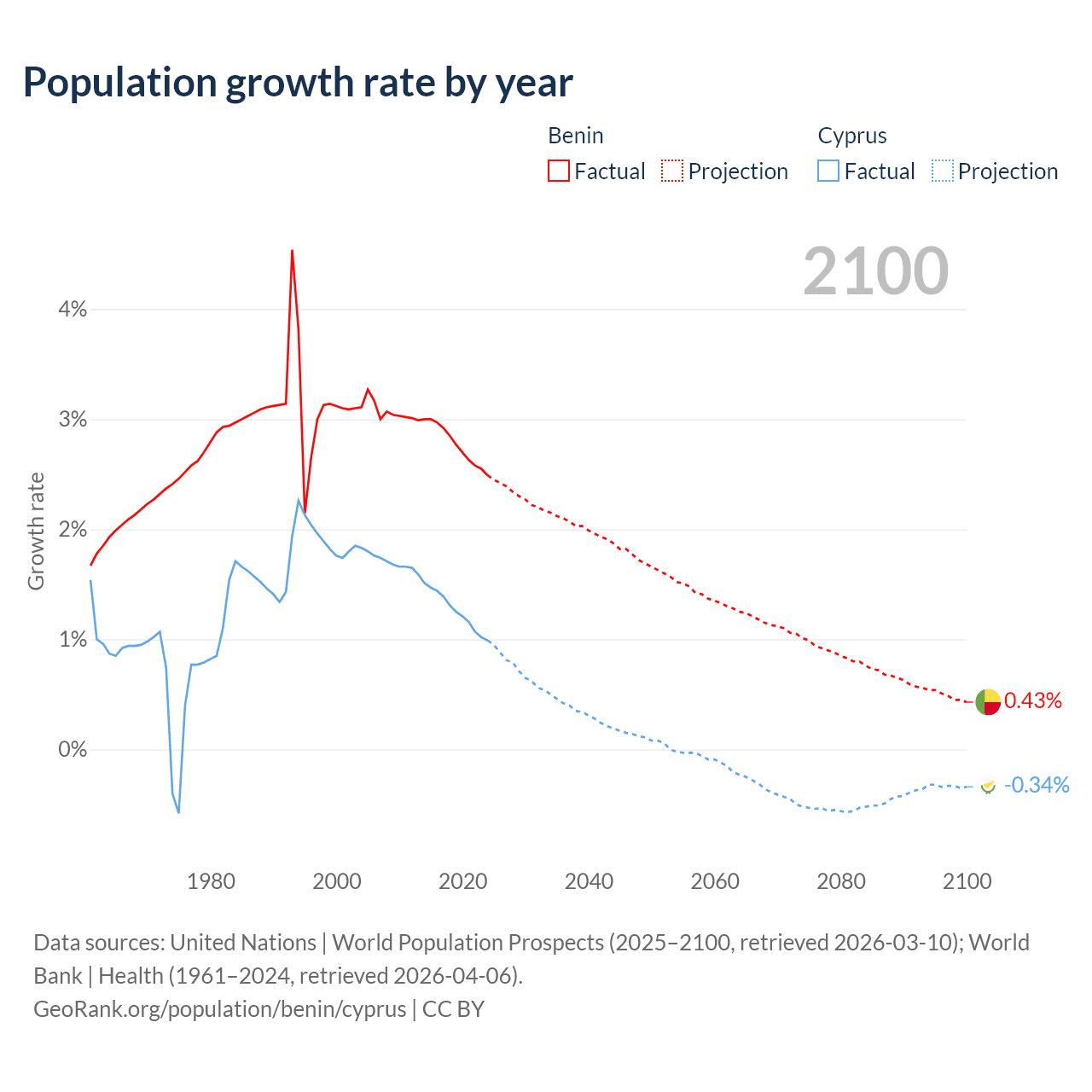 - For the last 10 years, Benin has had an average growth rate of +2.77% per year vs +1.26% in Cyprus.