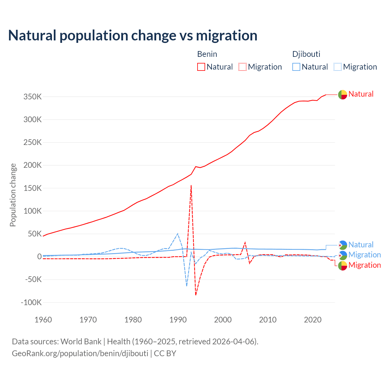 Over the last 10 years, 99.3% of the population change in Benin is from natural causes (a gain of 3,397,218 people) and 0.71% is from migration (a gain of 24,401 people). In Djibouti 92.1% is from natural causes (a gain of 153,892 people) and 7.87% is from migration (a gain of 13,138 people).