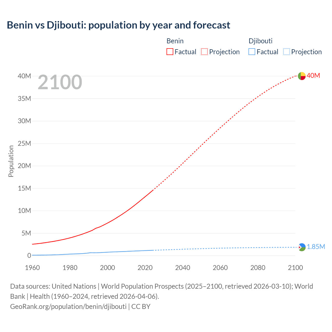The latest officially reported population of Benin was 14,462,724 in 2024 vs 1,168,722 people in Djibouti in 2024. In 2026, based on the adjusted UN estimation, the current Benin's population is 15,272,847 people compared to 1,203,929 in Djibouti.
