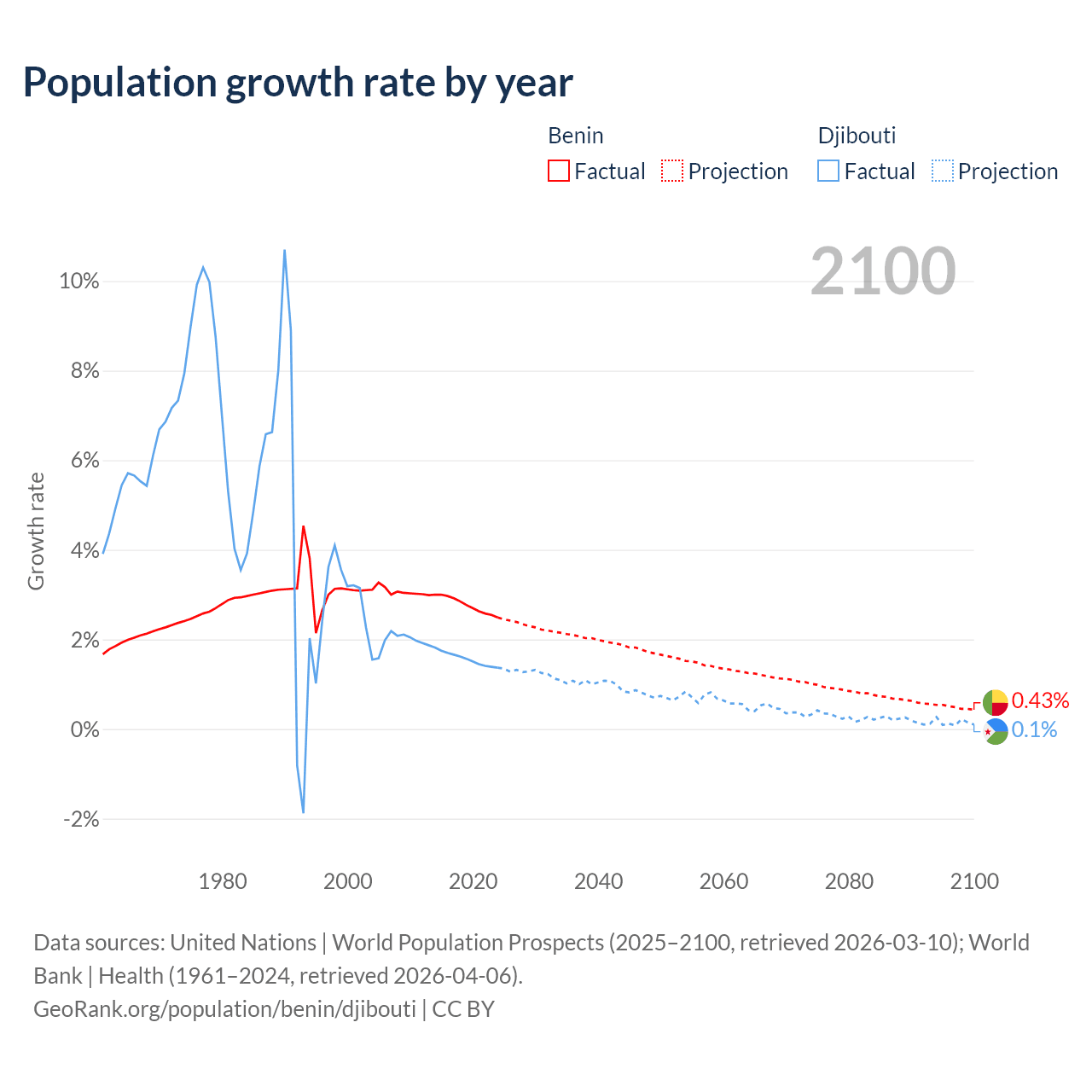 - For the last 10 years, Benin has had an average growth rate of +2.77% per year vs +1.57% in Djibouti.