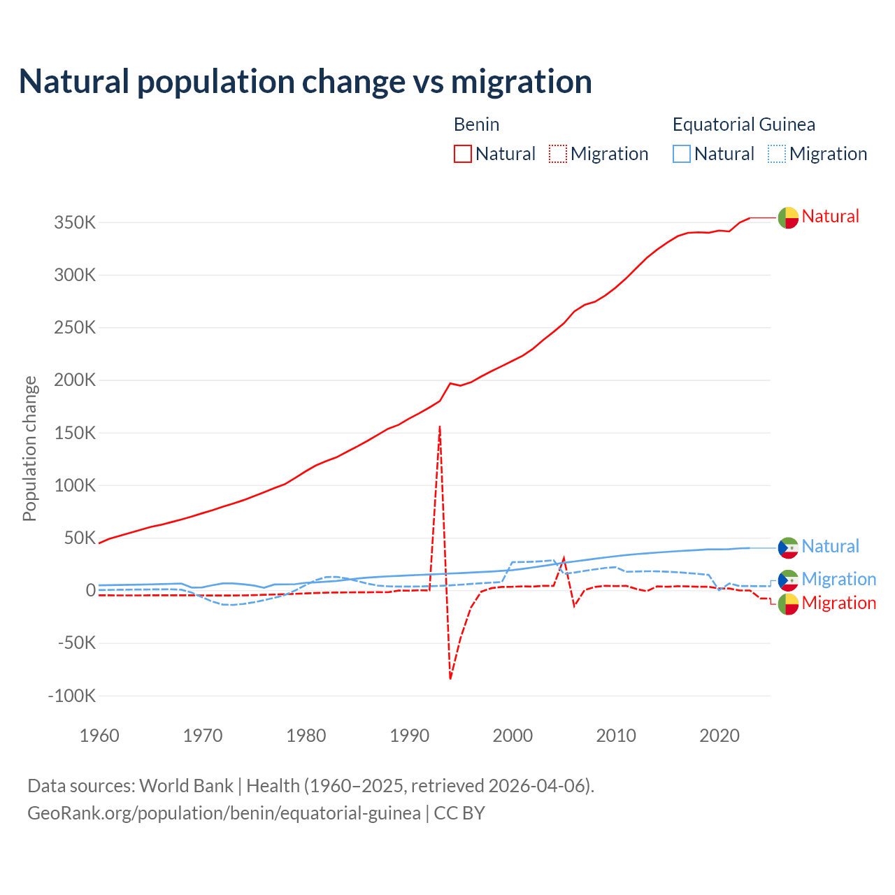 Over the last 10 years, 99.3% of the population change in Benin is from natural causes (a gain of 3,397,218 people) and 0.71% is from migration (a gain of 24,401 people). In Equatorial Guinea 77% is from natural causes (a gain of 382,745 people) and 23% is from migration (a gain of 114,024 people).