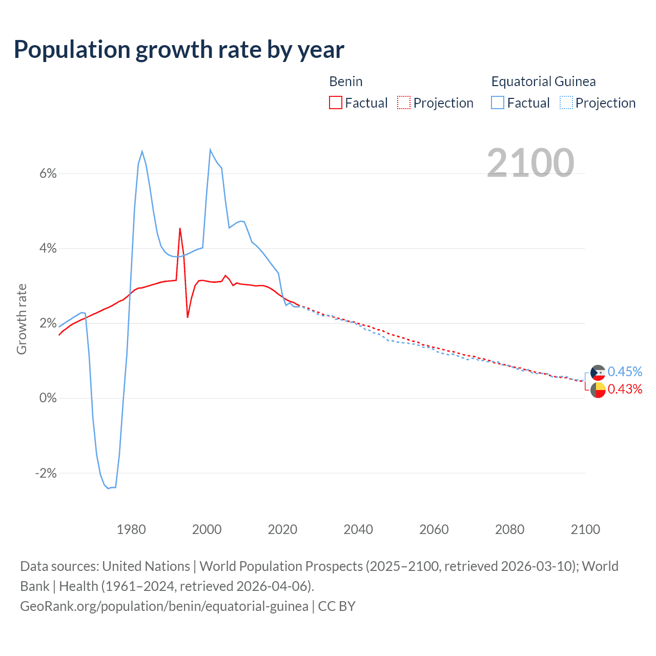 - For the last 10 years, Benin has had an average growth rate of +2.77% per year vs +3.15% in Equatorial Guinea.
