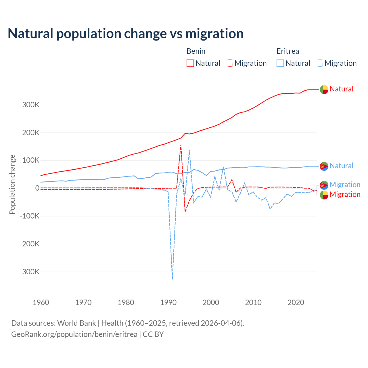 Over the last 10 years, 99.3% of the population change in Benin is from natural causes (a gain of 3,397,218 people) and 0.71% is from migration (a gain of 24,401 people). In Eritrea 68.8% is from natural causes (a gain of 742,837 people) and 31.2% is from migration (a loss of 336,243 people).