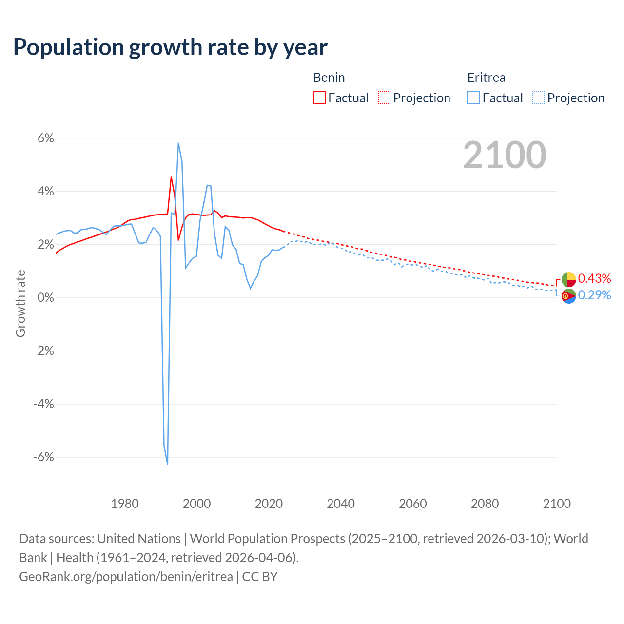 - For the last 10 years, Benin has had an average growth rate of +2.77% per year vs +1.28% in Eritrea.