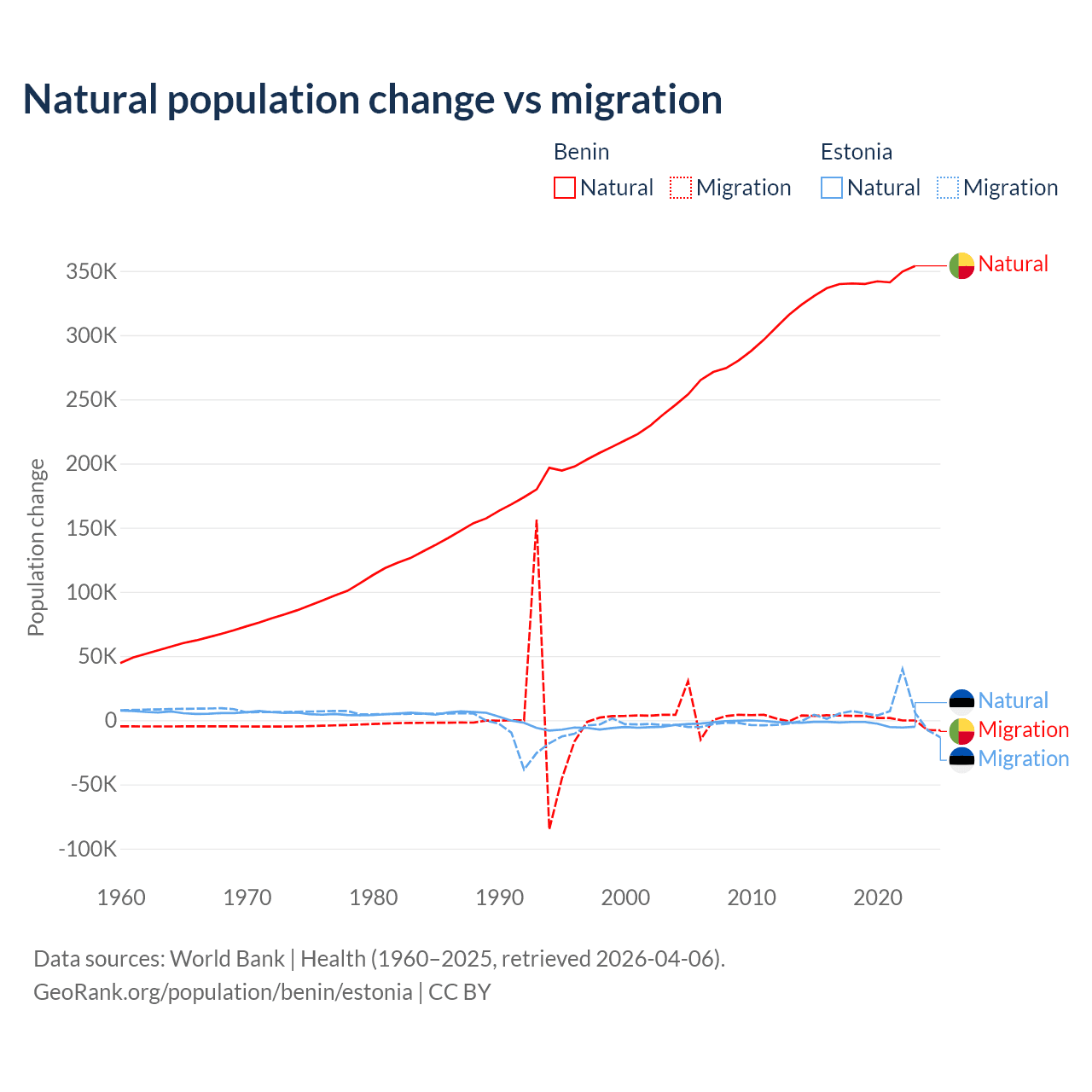 Over the last 10 years, 99.3% of the population change in Benin is from natural causes (a gain of 3,397,218 people) and 0.71% is from migration (a gain of 24,401 people). In Estonia 26.1% is from natural causes (a loss of 27,683 people) and 73.9% is from migration (a gain of 78,553 people).