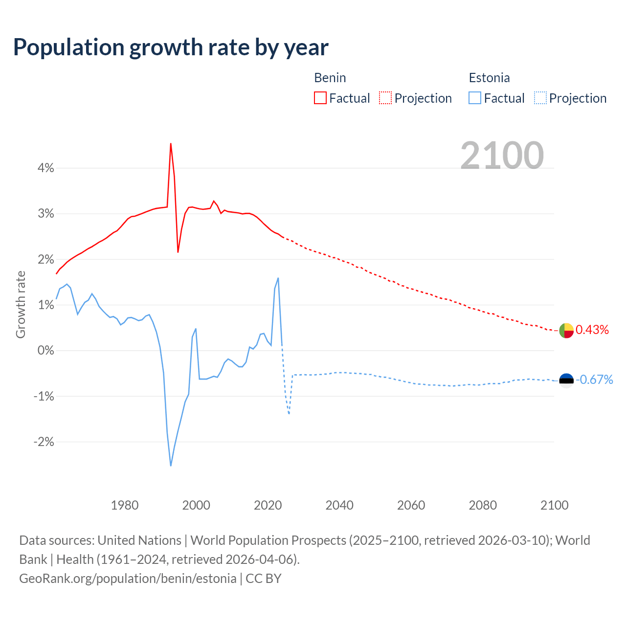 - For the last 10 years, Benin has had an average growth rate of +2.77% per year vs +0.37% in Estonia.