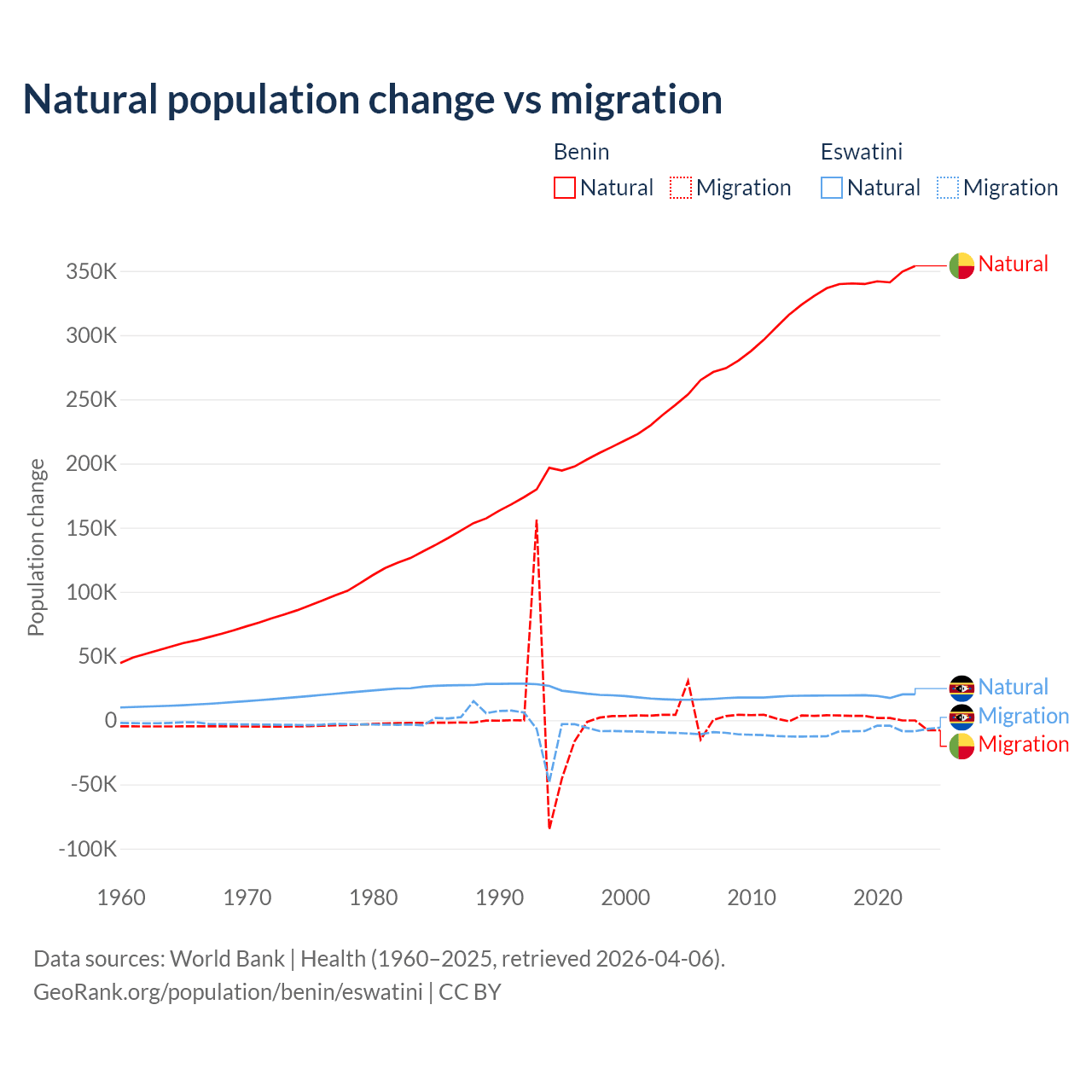 Over the last 10 years, 99.3% of the population change in Benin is from natural causes (a gain of 3,397,218 people) and 0.71% is from migration (a gain of 24,401 people). In Eswatini 68.3% is from natural causes (a gain of 192,206 people) and 31.7% is from migration (a loss of 89,012 people).