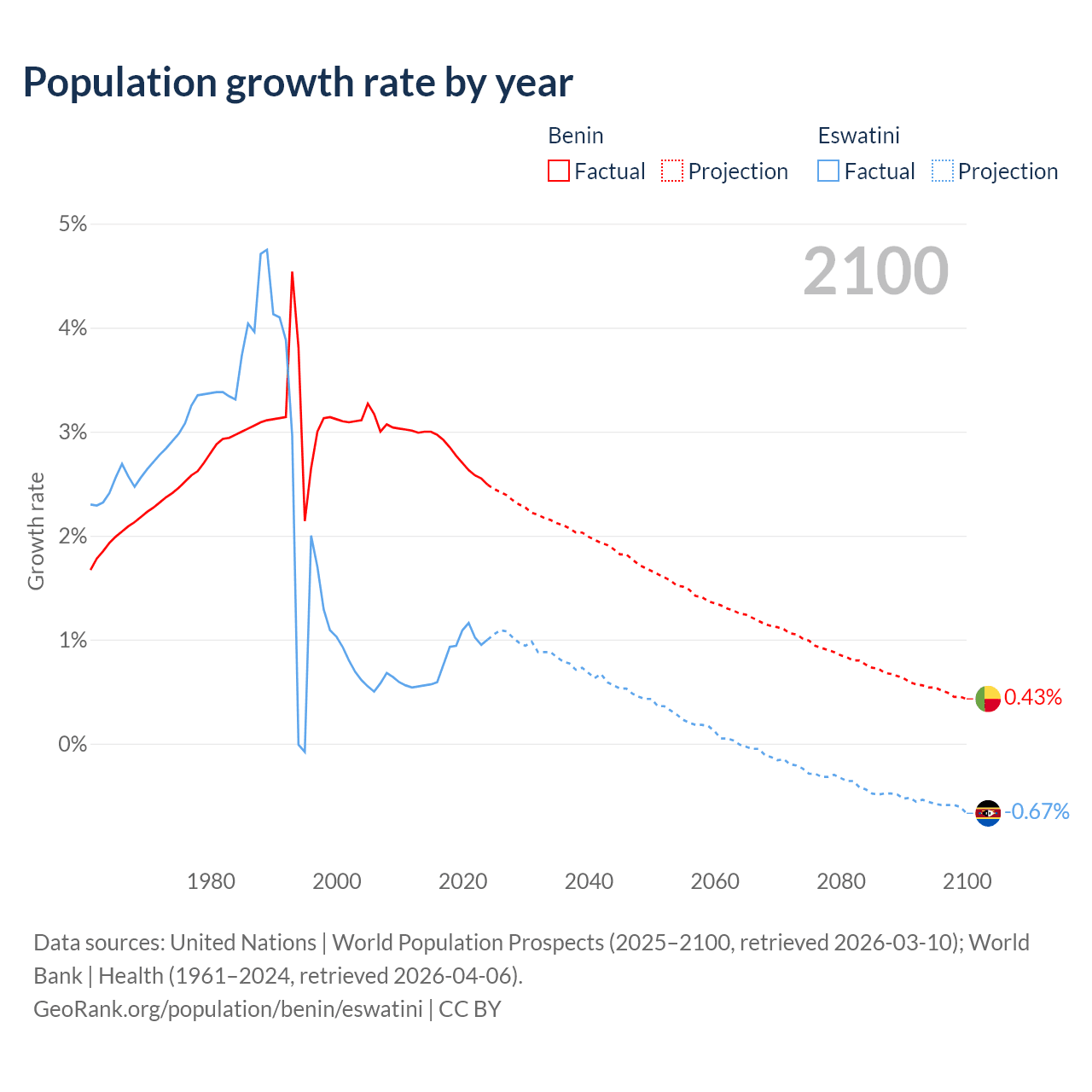 - For the last 10 years, Benin has had an average growth rate of +2.77% per year vs +0.87% in Eswatini.