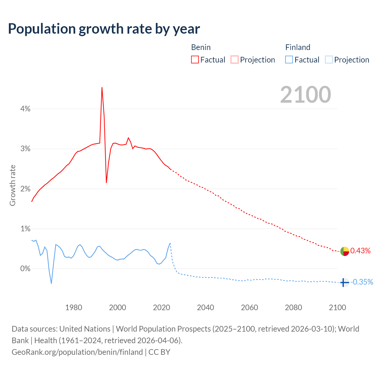 - For the last 10 years, Benin has had an average growth rate of +2.77% per year vs +0.3% in Finland.