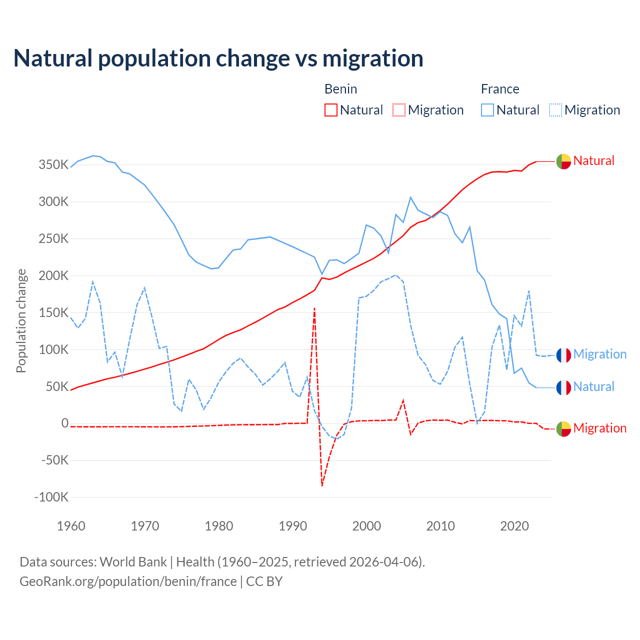 Over the last 10 years, 99.3% of the population change in Benin is from natural causes (a gain of 3,397,218 people) and 0.71% is from migration (a gain of 24,401 people). In France 59.5% is from natural causes (a gain of 1,359,540 people) and 40.5% is from migration (a gain of 923,723 people).