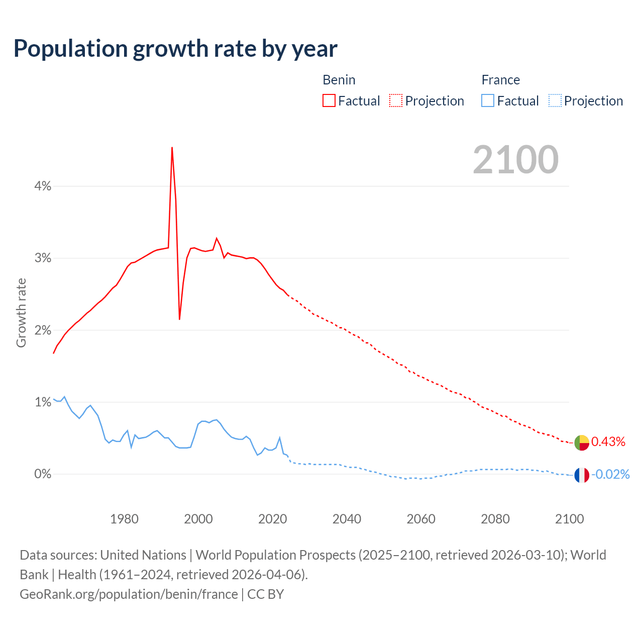- For the last 10 years, Benin has had an average growth rate of +2.77% per year vs +0.35% in France.