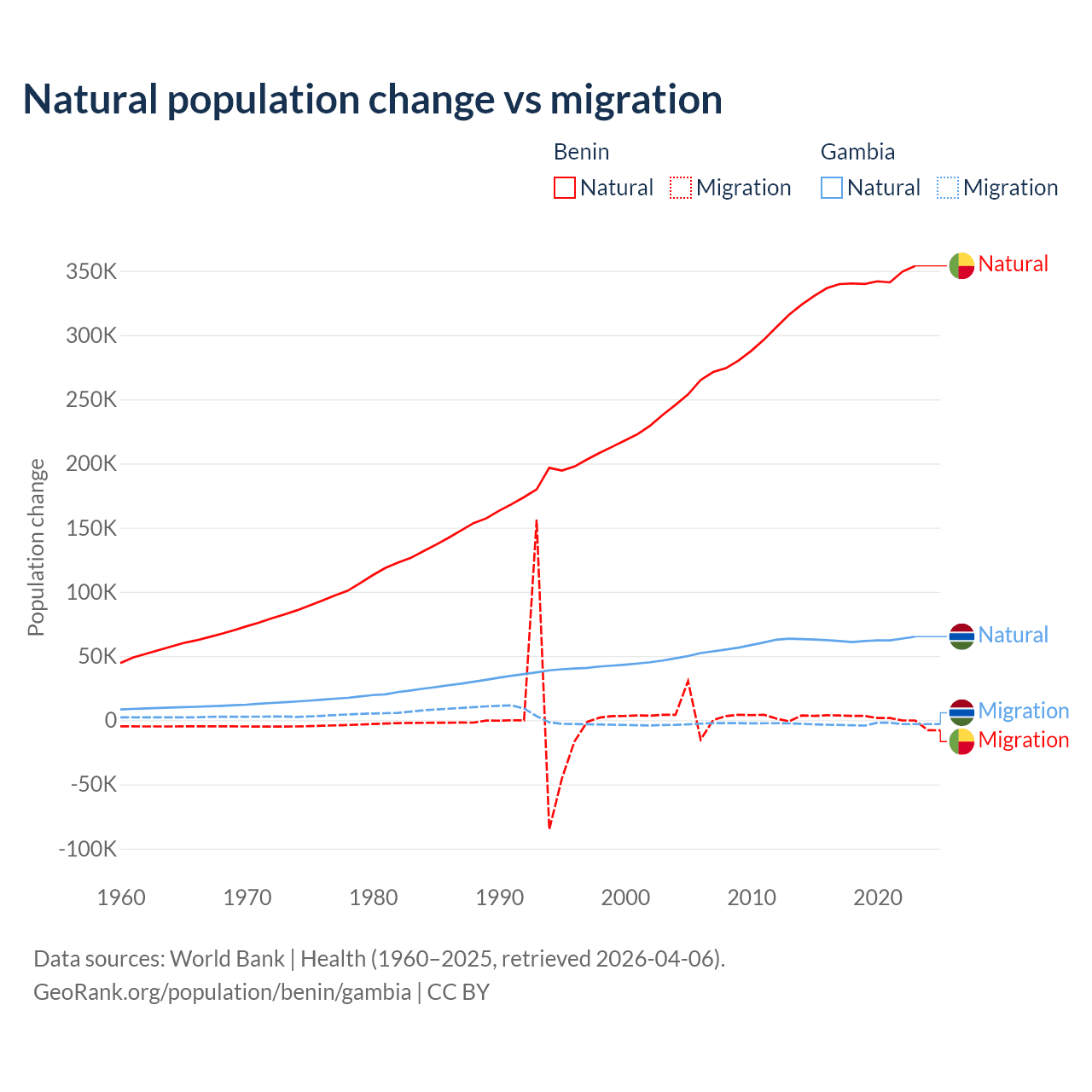 Over the last 10 years, 99.3% of the population change in Benin is from natural causes (a gain of 3,397,218 people) and 0.71% is from migration (a gain of 24,401 people). In the Gambia 95.2% is from natural causes (a gain of 625,795 people) and 4.75% is from migration (a loss of 31,227 people).