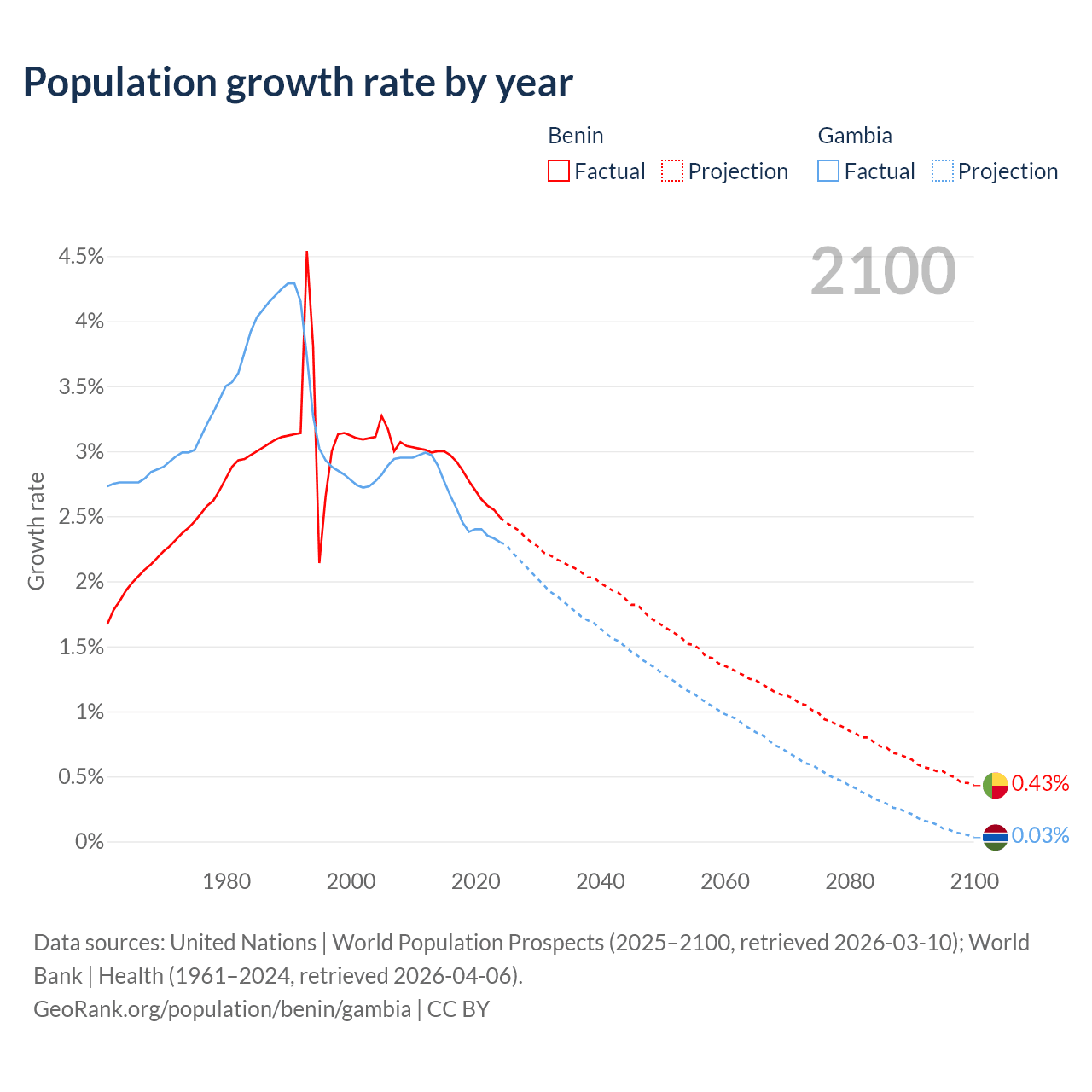 - For the last 10 years, Benin has had an average growth rate of +2.77% per year vs +2.5% in the Gambia.