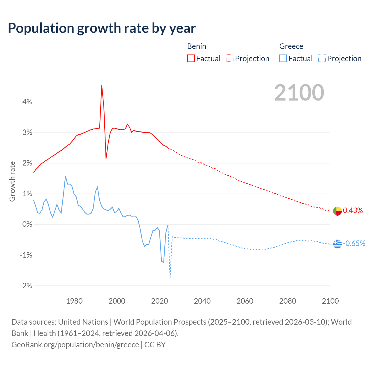 - For the last 10 years, Benin has had an average growth rate of +2.77% per year vs -0.47% in Greece.
