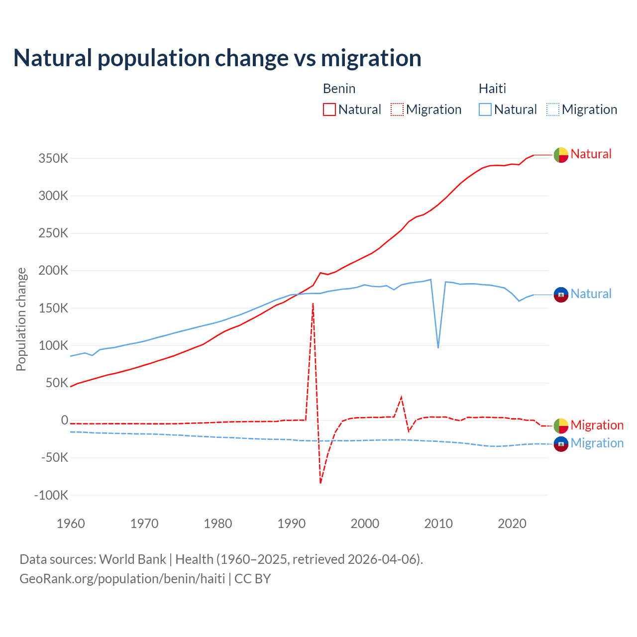 Over the last 10 years, 99.3% of the population change in Benin is from natural causes (a gain of 3,397,218 people) and 0.71% is from migration (a gain of 24,401 people). In Haiti 83.9% is from natural causes (a gain of 1,740,319 people) and 16.1% is from migration (a loss of 333,076 people).