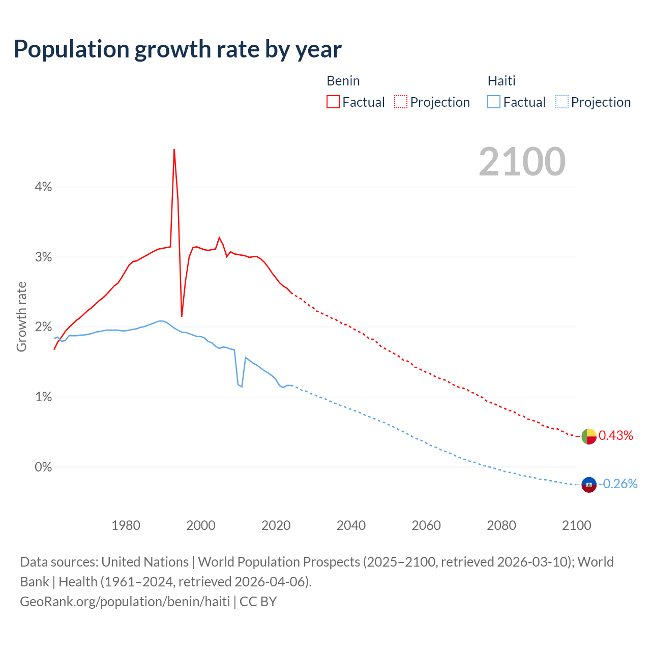 - For the last 10 years, Benin has had an average growth rate of +2.77% per year vs +1.29% in Haiti.