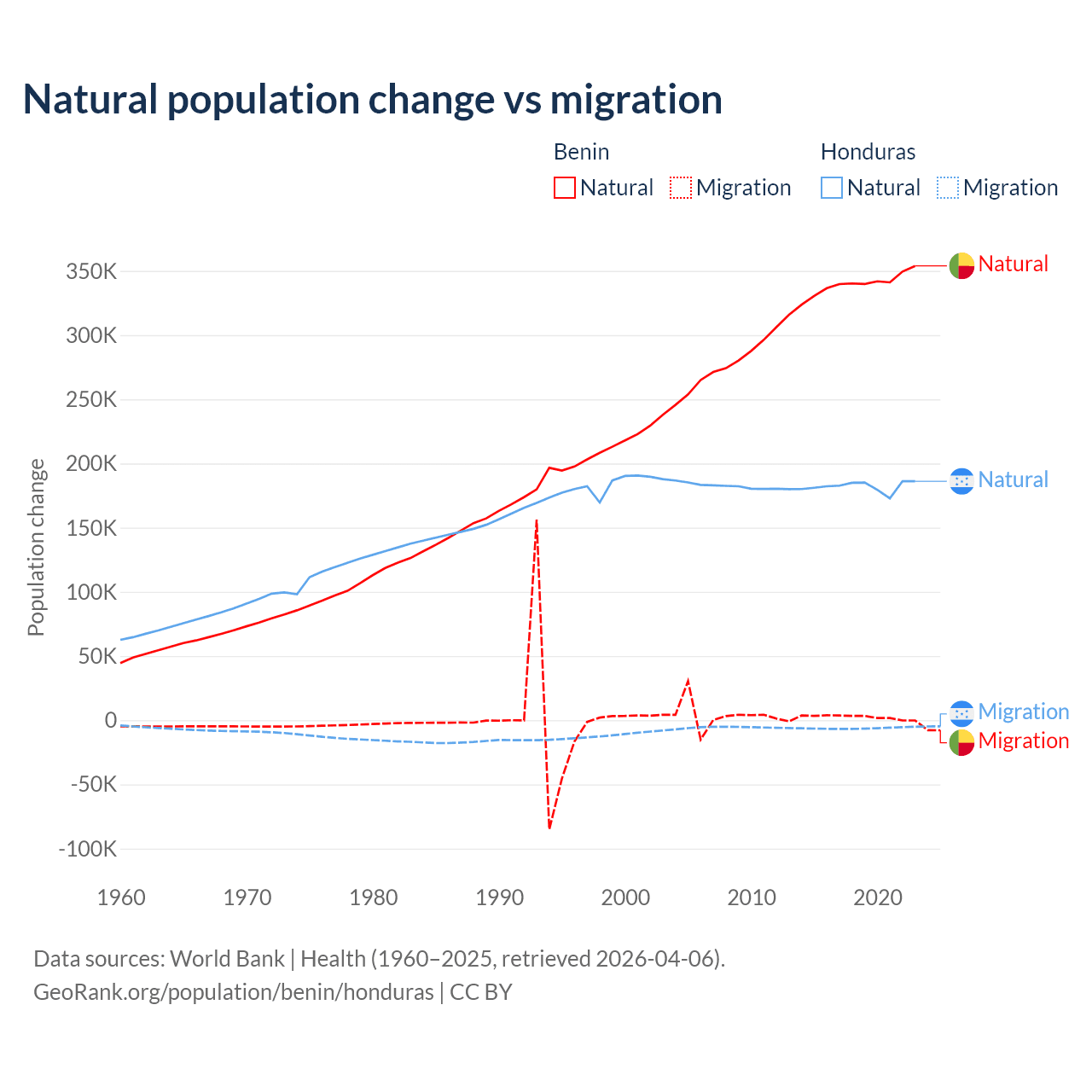 Over the last 10 years, 99.3% of the population change in Benin is from natural causes (a gain of 3,397,218 people) and 0.71% is from migration (a gain of 24,401 people). In Honduras 96.7% is from natural causes (a gain of 1,821,125 people) and 3.29% is from migration (a loss of 61,965 people).