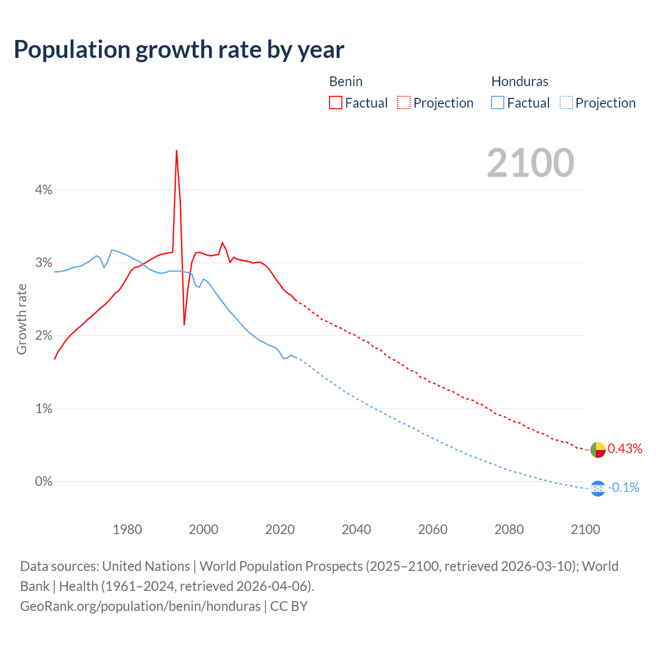 - For the last 10 years, Benin has had an average growth rate of +2.77% per year vs +1.81% in Honduras.