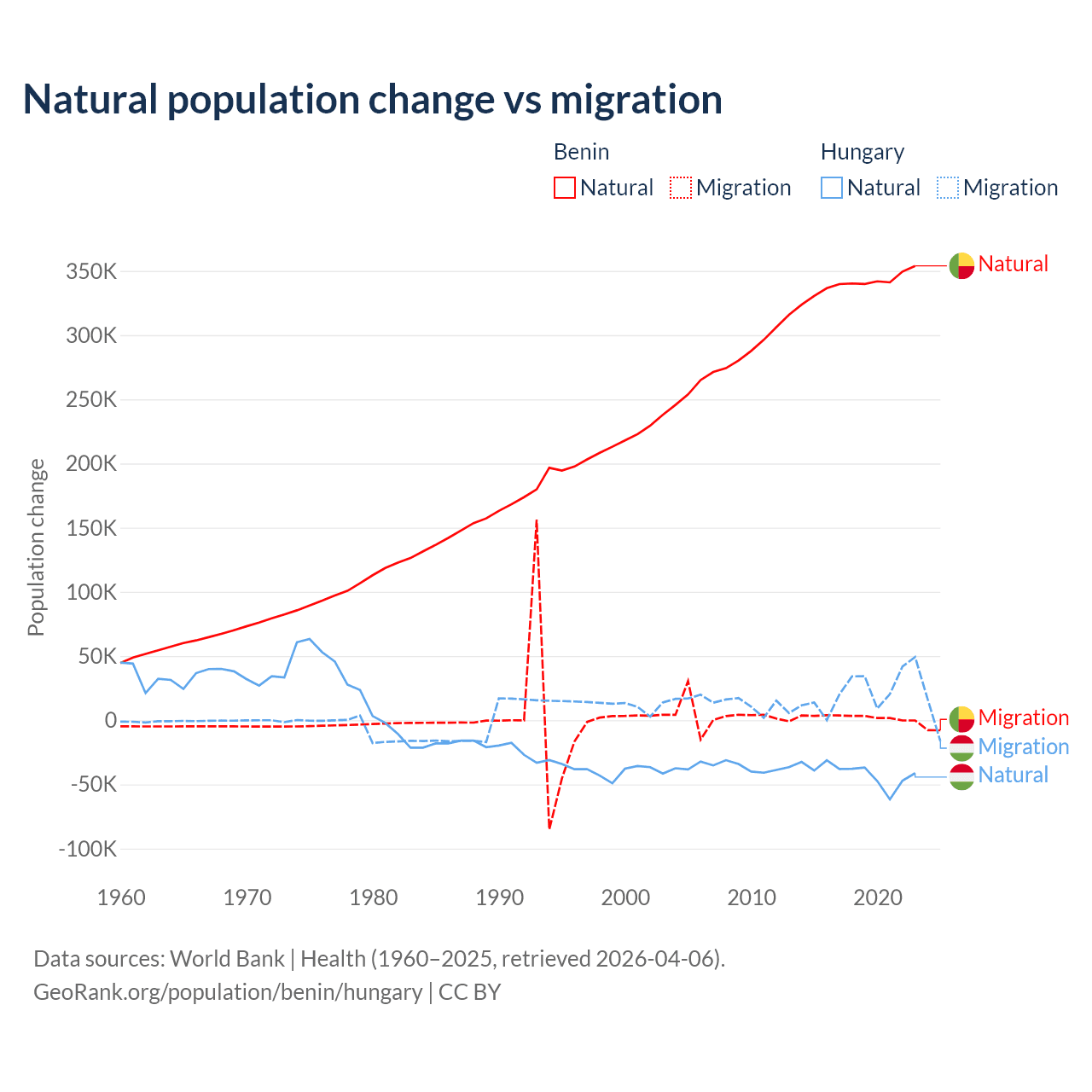 Over the last 10 years, 99.3% of the population change in Benin is from natural causes (a gain of 3,397,218 people) and 0.71% is from migration (a gain of 24,401 people). In Hungary 63.7% is from natural causes (a loss of 412,838 people) and 36.3% is from migration (a gain of 234,837 people).