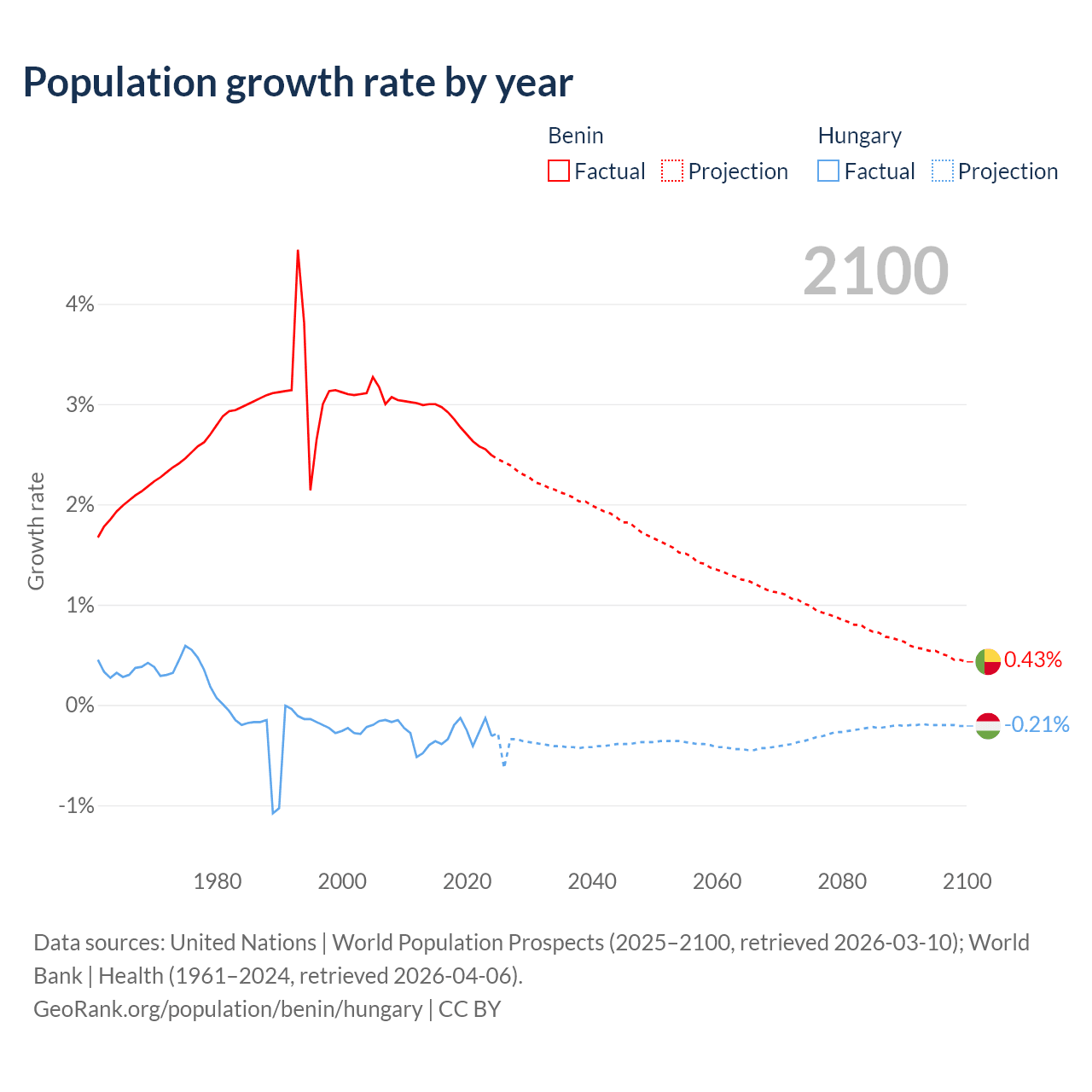 - For the last 10 years, Benin has had an average growth rate of +2.77% per year vs -0.29% in Hungary.