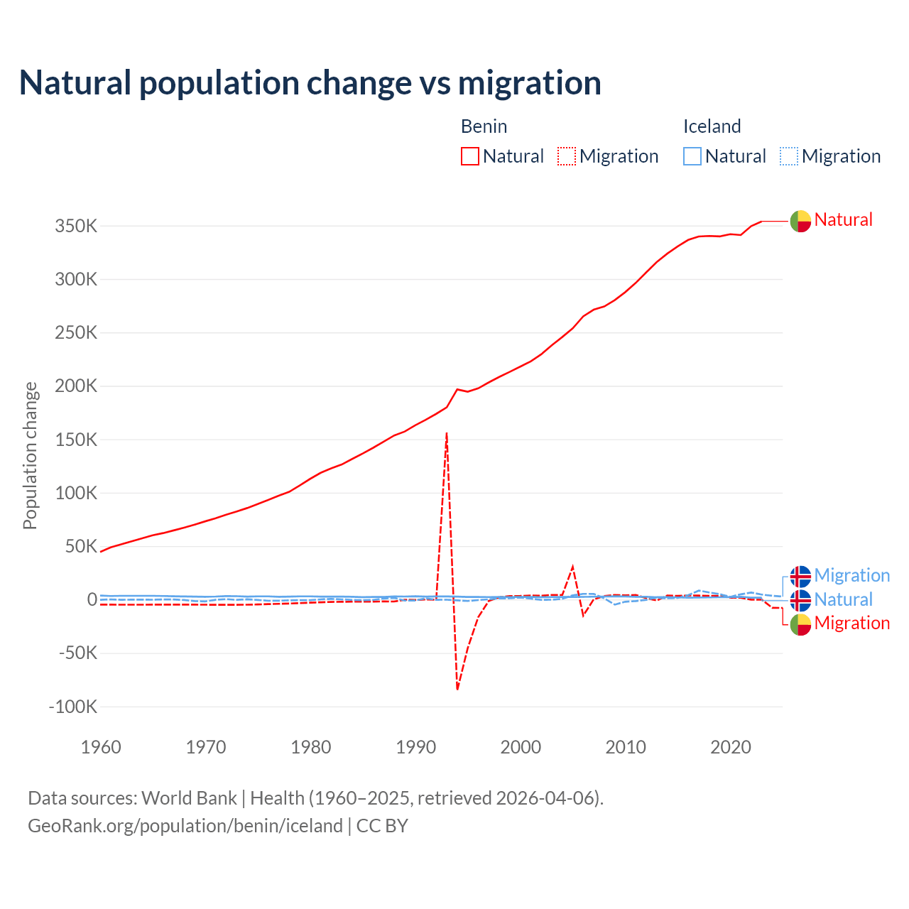 Over the last 10 years, 99.3% of the population change in Benin is from natural causes (a gain of 3,397,218 people) and 0.71% is from migration (a gain of 24,401 people). In Iceland 30.7% is from natural causes (a gain of 20,128 people) and 69.3% is from migration (a gain of 45,356 people).