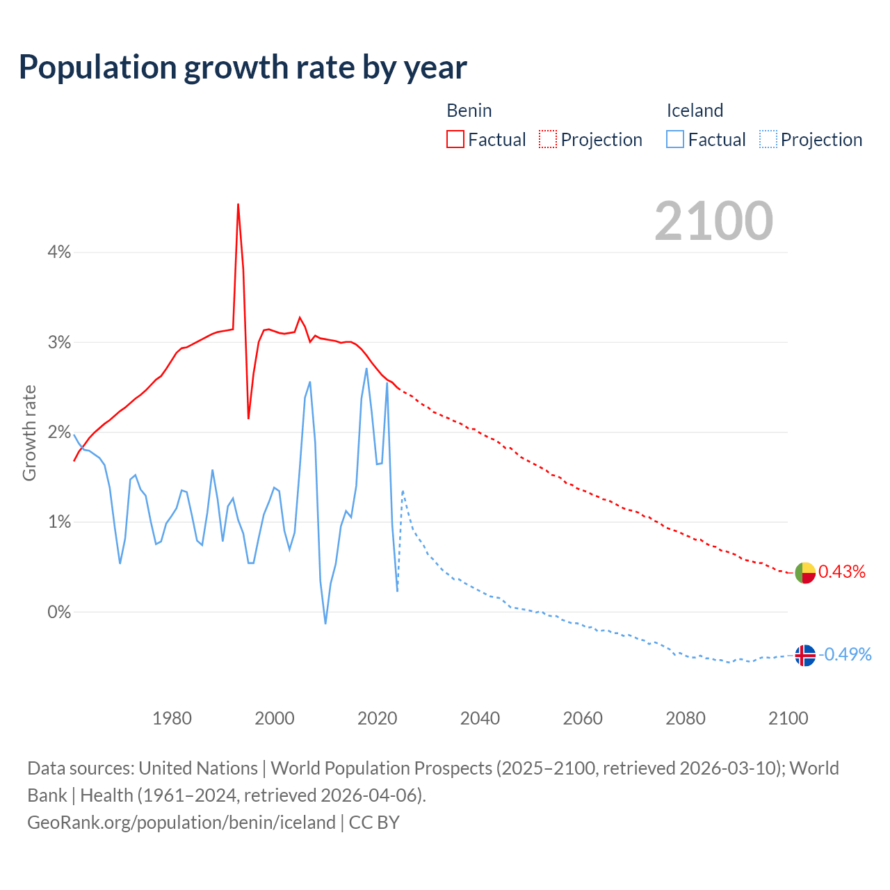 - For the last 10 years, Benin has had an average growth rate of +2.77% per year vs +1.63% in Iceland.