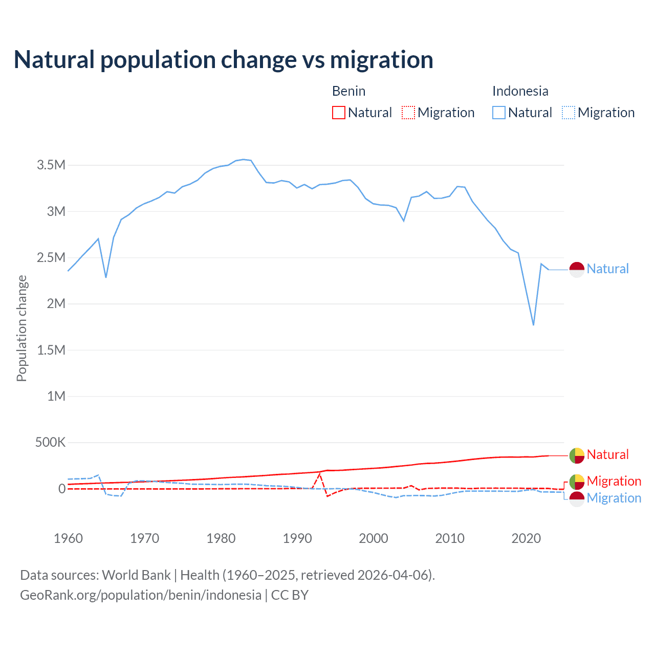 Over the last 10 years, 99.3% of the population change in Benin is from natural causes (a gain of 3,397,218 people) and 0.71% is from migration (a gain of 24,401 people). In Indonesia 98.9% is from natural causes (a gain of 25,242,860 people) and 1.1% is from migration (a loss of 280,258 people).