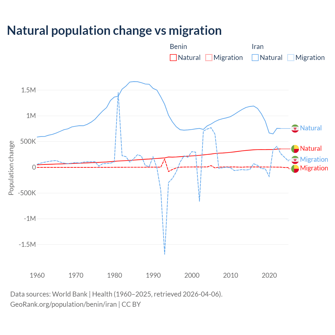 Over the last 10 years, 99.3% of the population change in Benin is from natural causes (a gain of 3,397,218 people) and 0.71% is from migration (a gain of 24,401 people). In Iran 92.5% is from natural causes (a gain of 9,405,860 people) and 7.46% is from migration (a gain of 757,979 people).